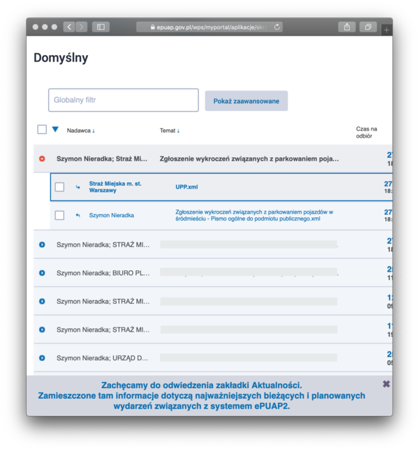 16. Nie zdziw się, że na twojej liście pism, dostępnej na https://epuap.gov.pl/wps/myportal/aplikacje/skrzynka praktycznie od razu znajdziesz nieodczytaną wiadomość na czerwono. Ta czerwień nie oznacza błędu. To tylko Urzędowe Potwierdzenie Odbioru twojej wiadomości w postaci kompletnie nieczytelnego pliku UPP.xml;