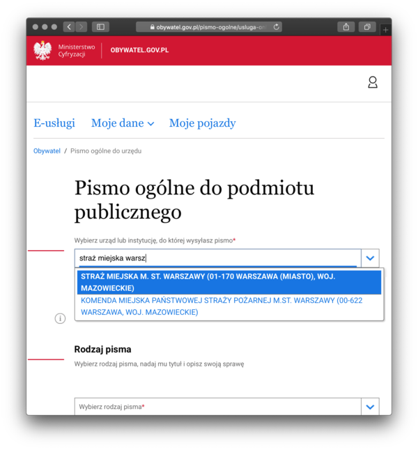 5. W polu z adresatem zacznij wpisywać "straż miejska [nazwa twojego miasta]", a następnie wybierz z listy odpowiednią instytucję;
