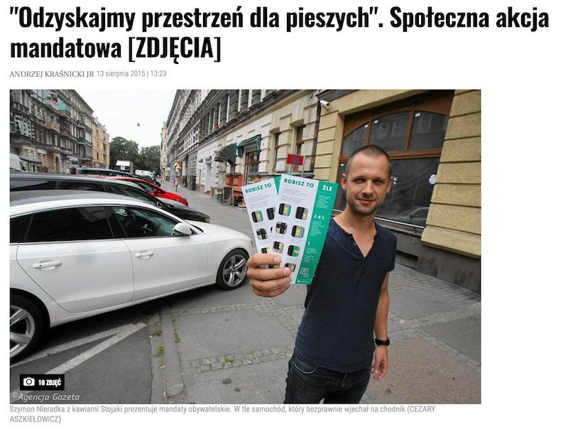 Była to społeczna akcja, w ramach której wręczyliśmy kilkaset "mandatów społecznych" (pobierz mandat w wersji do druku) osobom parkującym w sposób zagrażający bezpieczeństwu i komfortowi pieszych w Szczecinie.