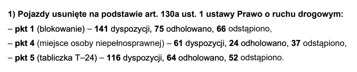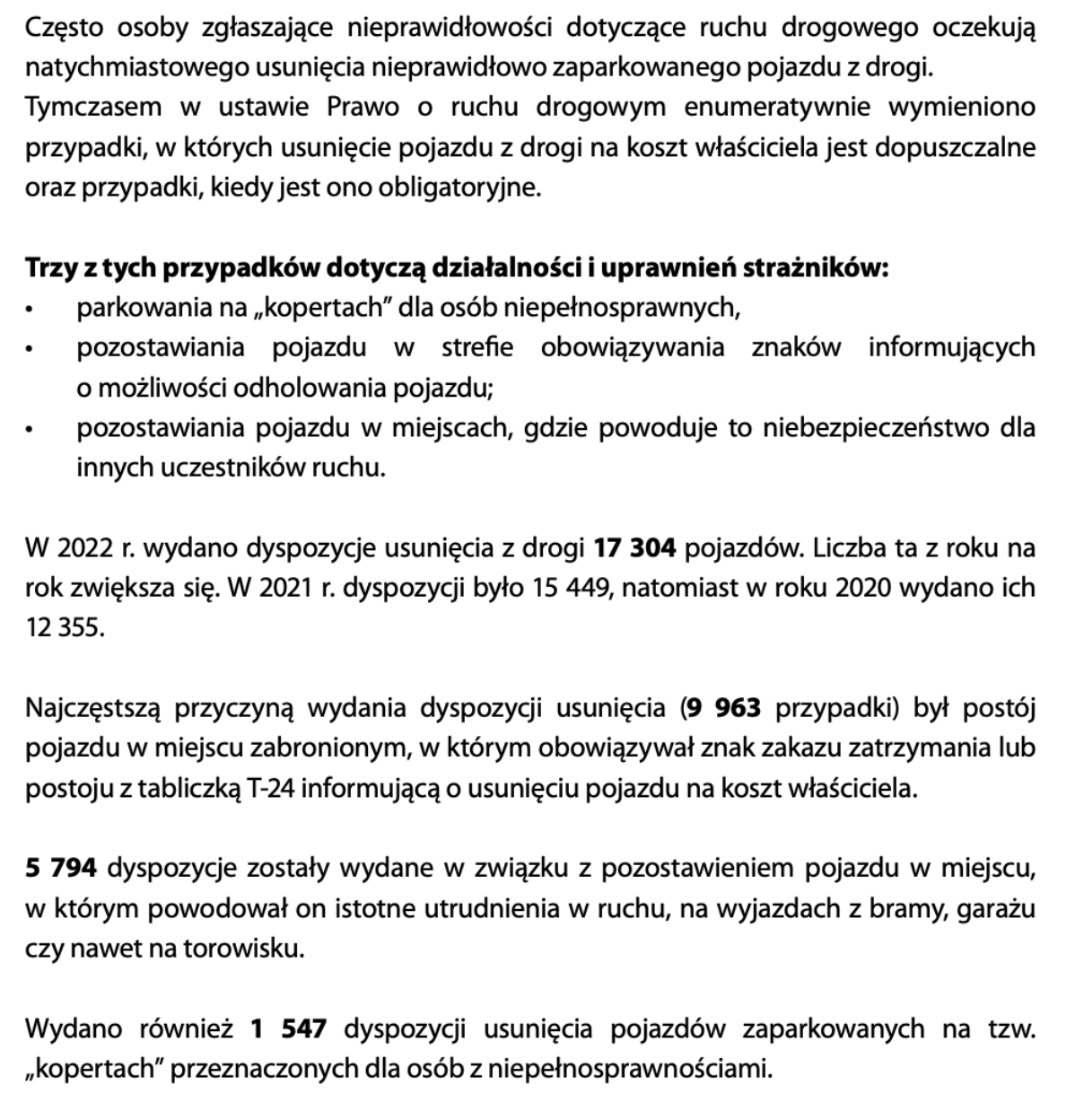 Analogiczny raport SM Warszawa za rok 2022 (na stronie 52) także podaje trzy powody usunięcia pojazdów. Również nie wymienia usunięć pojazdów „ze względu na stworzenie zagrożenia bezpieczeństwa”. Co więcej, raport SM Warszawa mówi wprost o ograniczaniu ustawowym wiążącym ręce strażnikom: